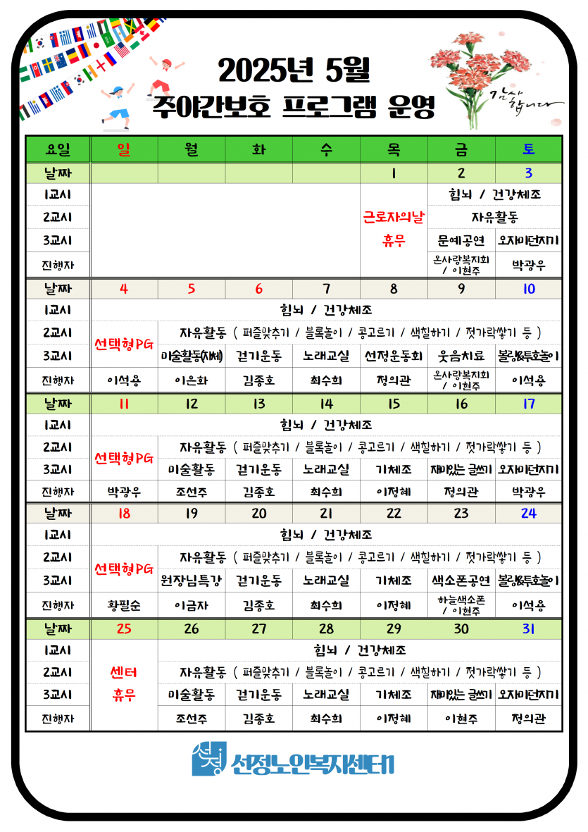 2025년 5월 주야간보호 프로그램 일정표 페이지 정보 작성자 최고관리자 댓글 0건 조회 421회 작성일 25-04-30 18:22 본문 5월 주야간보호 프로그램 일정표 입니다. ※ 8일 선정 봄 운동회 진행. 목록 이전글2025년 5월 치매전담실 프로그램 일정표 25.04.30 다음글2025년 5월 휴무일 안내 25.04.30