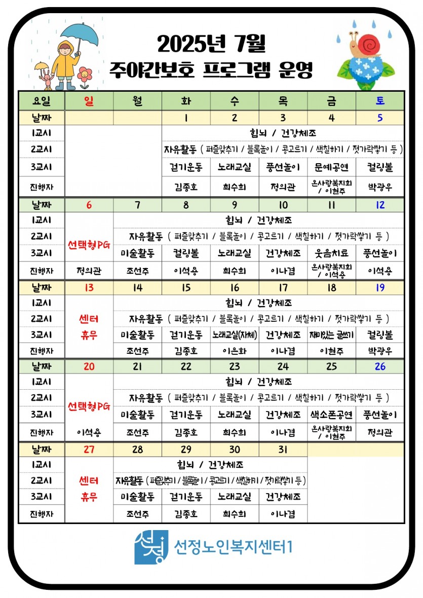 2025년 7월 주야간보호 프로그램 일정표 페이지 정보 작성자 최고관리자 댓글 0건 조회 322회 작성일 25-07-01 10:48 본문 7월 주야간보호 프로그램 일정표 입니다. 목록 이전글2025년 7월 치매전담실 프로그램 일정표 25.07.01 다음글2025년 7월 휴무일 안내 25.07.01