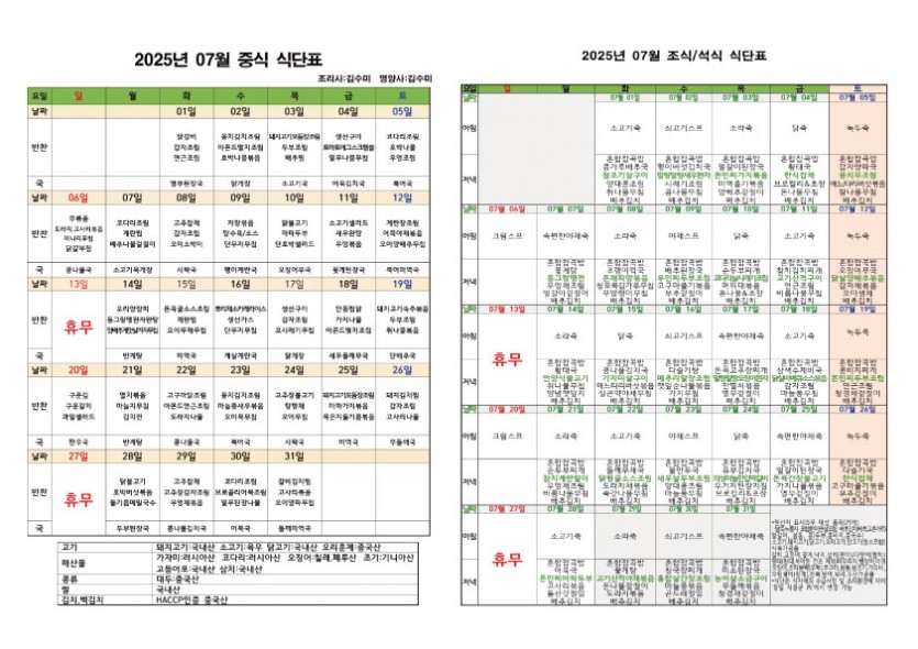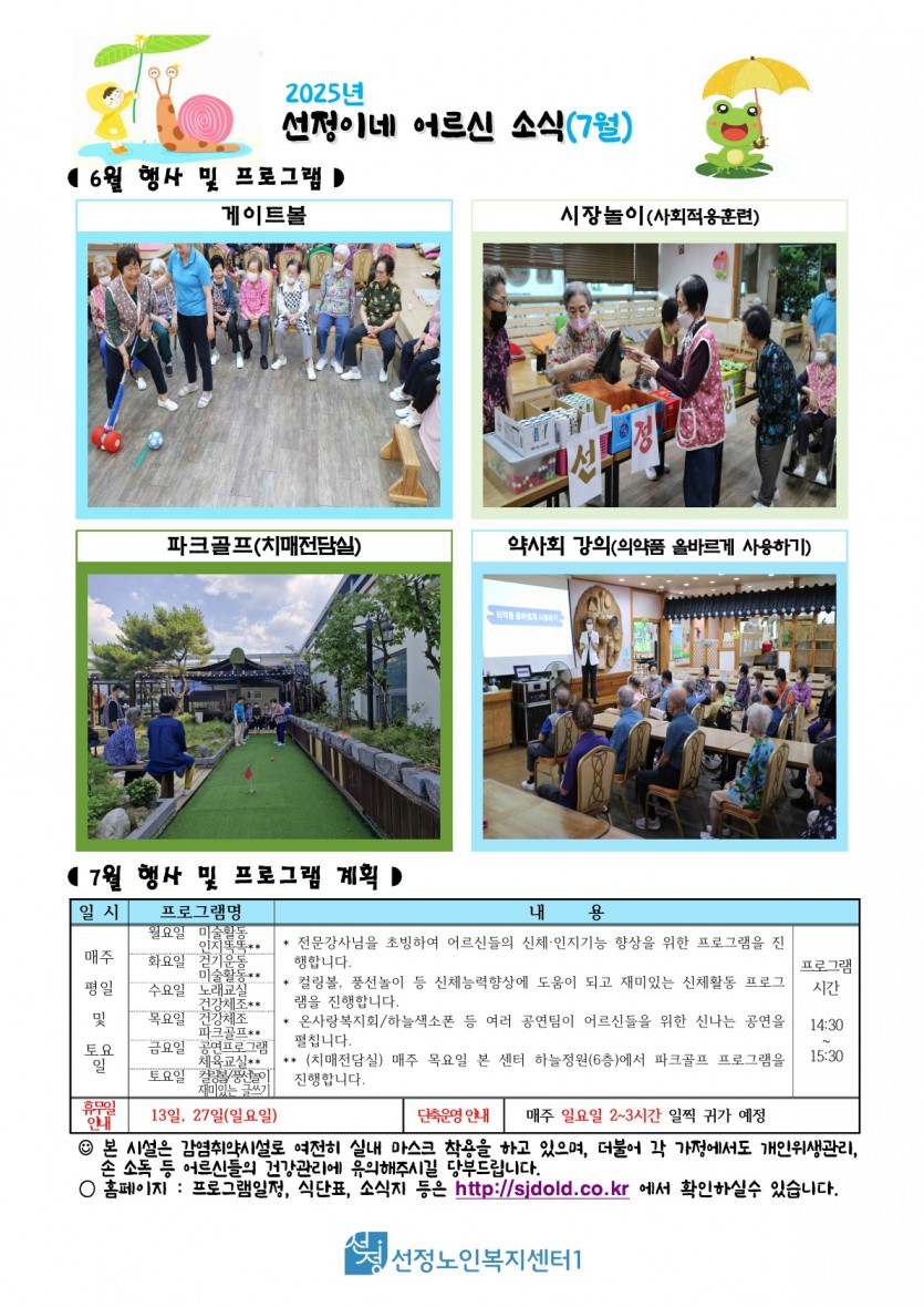 2025년 7월 소식지 및 식단표 페이지 정보 작성자 최고관리자 댓글 0건 조회 324회 작성일 25-07-01 10:53 본문 7월 소식지 및 식단표 입니다. 목록 이전글2025년 8월 휴무일 안내 25.08.02 다음글2025년 7월 치매전담실 프로그램 일정표 25.07.01