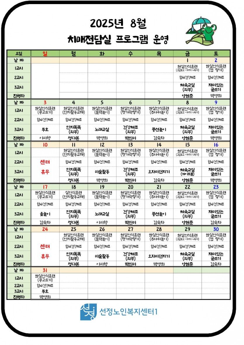2025년 8월 치매전담실 프로그램 일정표 페이지 정보 작성자 최고관리자 댓글 0건 조회 265회 작성일 25-08-02 10:12 본문 2025년 8월 치매전담실 프로그램 일정표 입니다. 목록 이전글2025년 8월 소식지 및 식단표 25.08.02 다음글2025년 8월 주야간 프로그램 일정표 25.08.02