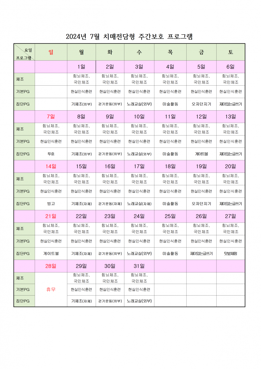 2024년 7월 치매전담실 프로그램 일정표 페이지 정보 작성자 최고관리자 댓글 0건 조회 1,783회 작성일 24-07-02 11:13 본문 치매전담실 프로그램 일정표 입니다. 목록 이전글2024년 8월 휴무일 안내 24.08.01 다음글2024년 7월 주야간보호 프로그램 일정표 24.07.01