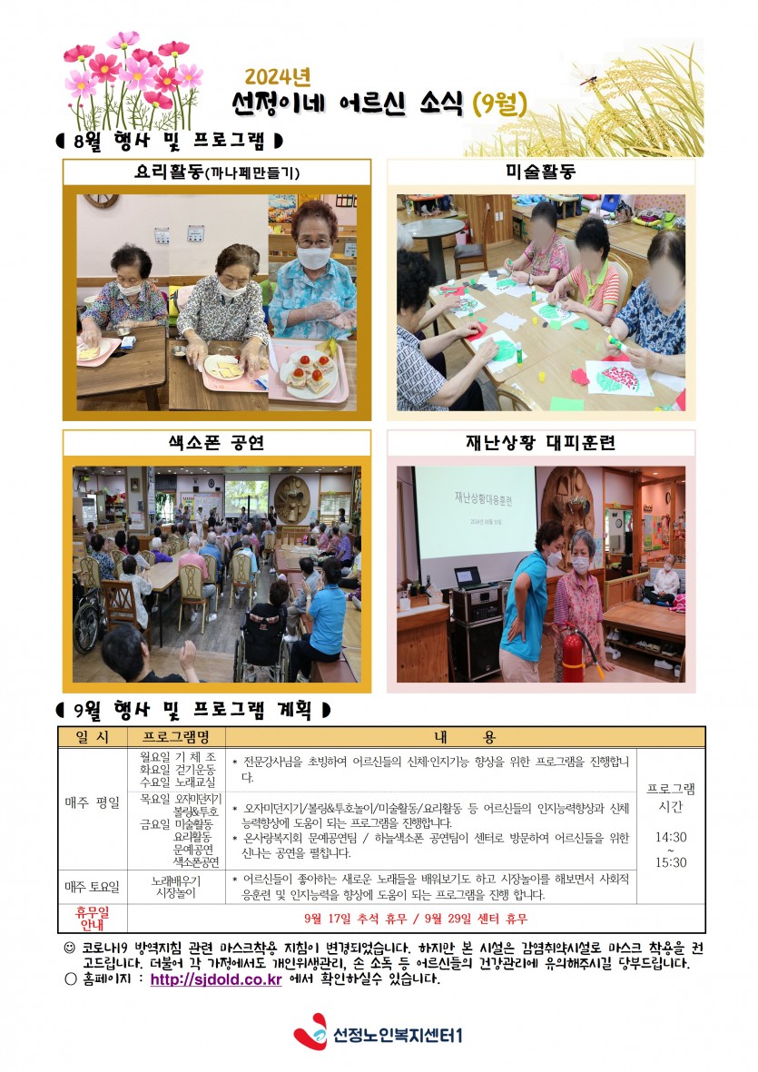 2024년 9월 소식지 및 식단표 페이지 정보 작성자 최고관리자 댓글 0건 조회 1,490회 작성일 24-08-31 18:48 본문 9월 소식지 및 식단표 목록 이전글2024년 9월 주야간보호 프로그램 일정표 24.08.31 다음글2024년 9월 휴무일 안내 24.08.31