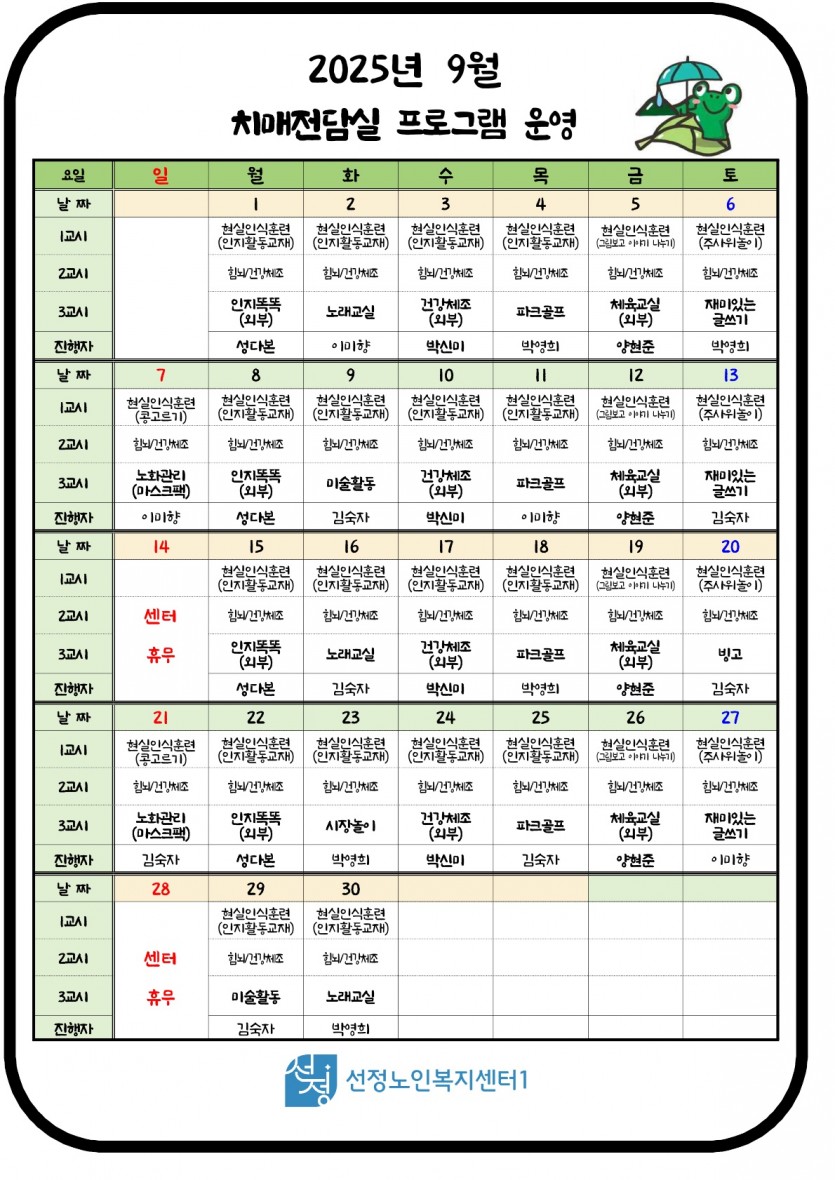 2025년 9월 치매전담실 프로그램 운영표 페이지 정보 작성자 최고관리자 댓글 0건 조회 208회 작성일 25-08-31 11:52 본문 2025년 9월 치매전담실 프로그램 운영표 입니다. 목록 이전글2025년 9월 식단표 및 소식지 25.08.31 다음글2025년 9월 주야간 프로그램 일정 25.08.31