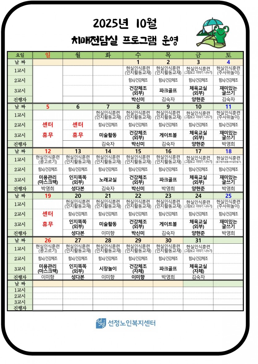 2025년 10월 치매전담실 프로그램 일정표 페이지 정보 작성자 최고관리자 댓글 0건 조회 147회 작성일 25-09-30 15:19 본문 2025년 10월 치매전담실 프로그램 일정표 입니다. 목록 이전글2025년 10월 식단표 및 소식지 25.09.30 다음글2025년 10월 주야간 프로그램 일정표 25.09.30