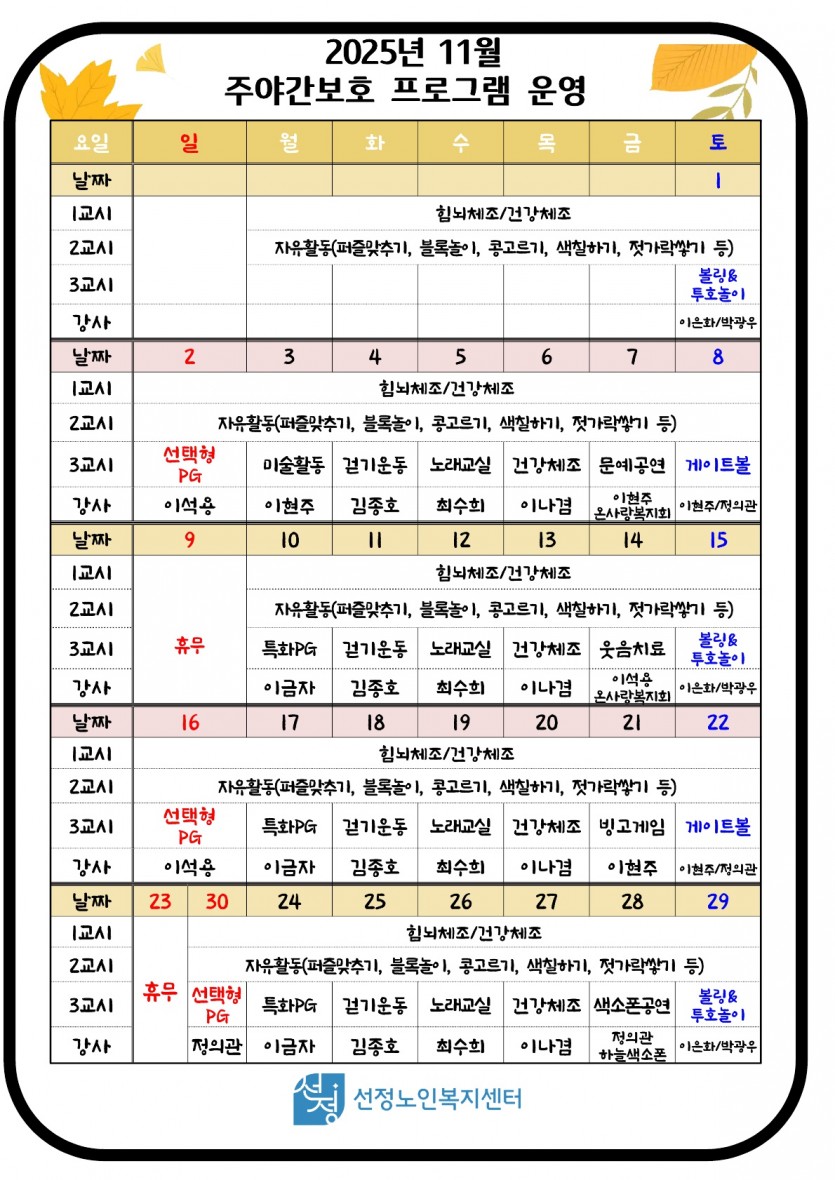 2025년 11월 주야간 프로그램 운영표 페이지 정보 작성자 최고관리자 댓글 0건 조회 90회 작성일 25-10-30 16:05 본문 * 2025년 11월 주야간 프로그램 운영표 입니다. 목록 이전글2025년 11월 치매전담실 프로그램 운영표 25.10.30 다음글2025년 11월 휴무일 안내 25.10.21
