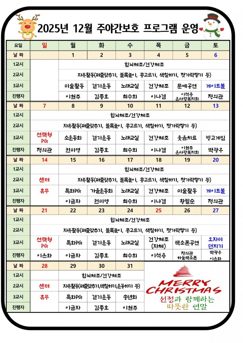 2025년 12월 주야간 프로그램 운영표 페이지 정보 작성자 최고관리자 댓글 0건 조회 37회 작성일 25-11-28 13:38 본문 * 2025년 12월 주야간 프로그램 운영표 입니다. 목록 이전글2025년 12월 치매전담실 프로그램 운영표 25.11.28 다음글2025년 12월 휴무일 안내 25.11.25