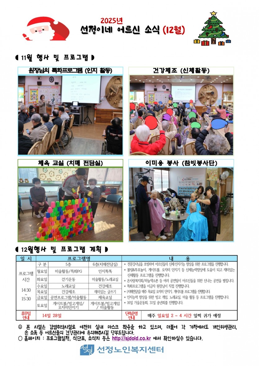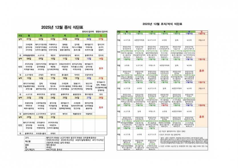 2025년 12월 식단표 및 소식지 페이지 정보 작성자 최고관리자 댓글 0건 조회 49회 작성일 25-11-28 13:39 본문 * 2025년 12월 식단표 및 소식지 입니다. 목록 다음글2025년 12월 치매전담실 프로그램 운영표 25.11.28