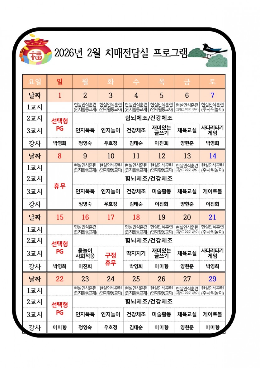 2026년 2월 치매전담실 프로그램 운영표 페이지 정보 작성자 최고관리자 댓글 0건 조회 122회 작성일 26-01-31 14:15 본문 2026년 2월 치매전담실 프로그램 운영표 입니다. 목록 이전글2026년 2월 식단표 및 소식지 26.01.31 다음글2026년 2월 주야간 프로그램 운영표 26.01.31