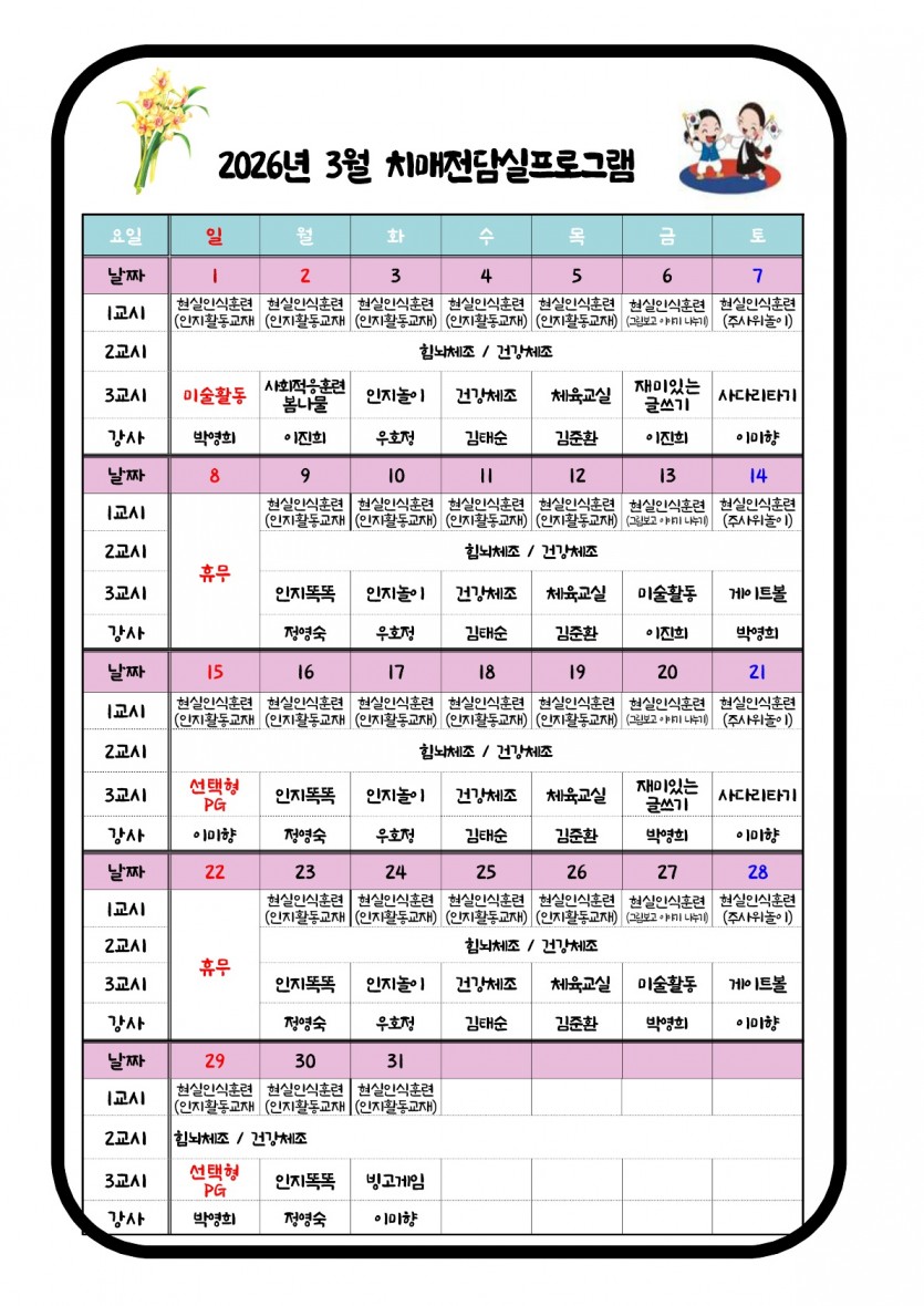 2026년 3월 치매전담실 프로그램 운영표 페이지 정보 작성자 최고관리자 댓글 0건 조회 32회 작성일 26-02-28 11:51 본문 2026년 3월 치매전담실 프로그램 운영표 입니다. 목록 이전글2026년 3월 식단표 및 소식지 26.02.28 다음글2026년 3월 주야간 프로그램 운영표 26.02.28