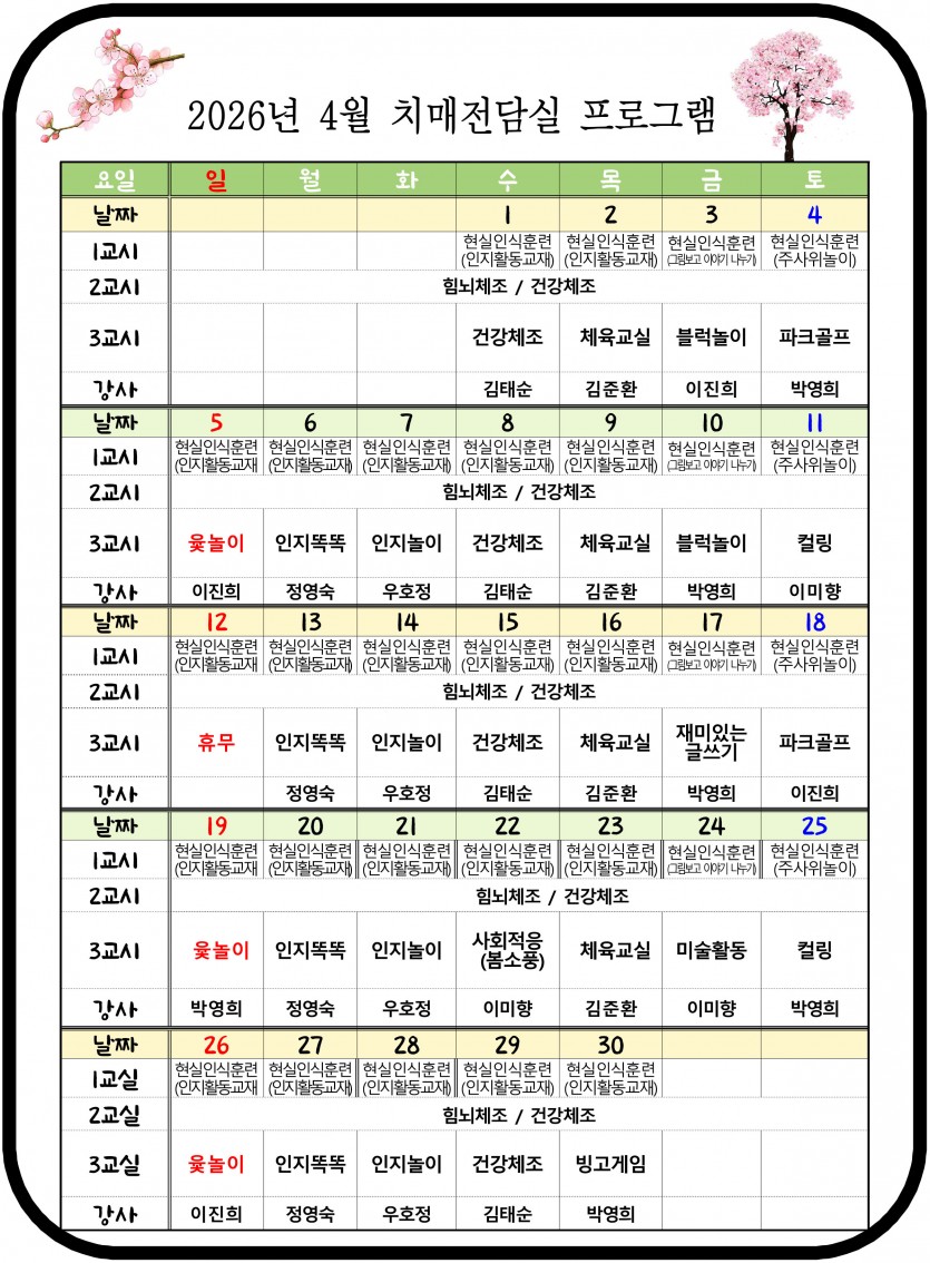 2026년 4월 치매전담실 프로그램 운영표 페이지 정보 작성자 최고관리자 댓글 0건 조회 97회 작성일 26-03-31 14:55 본문 2026년 4월 치매전담실 프로그램 운영표 입니다. 목록 이전글2026년 4월 식단표 및 소식지 26.03.31 다음글2026년 4월 주야간 프로그램 운영표 26.03.31