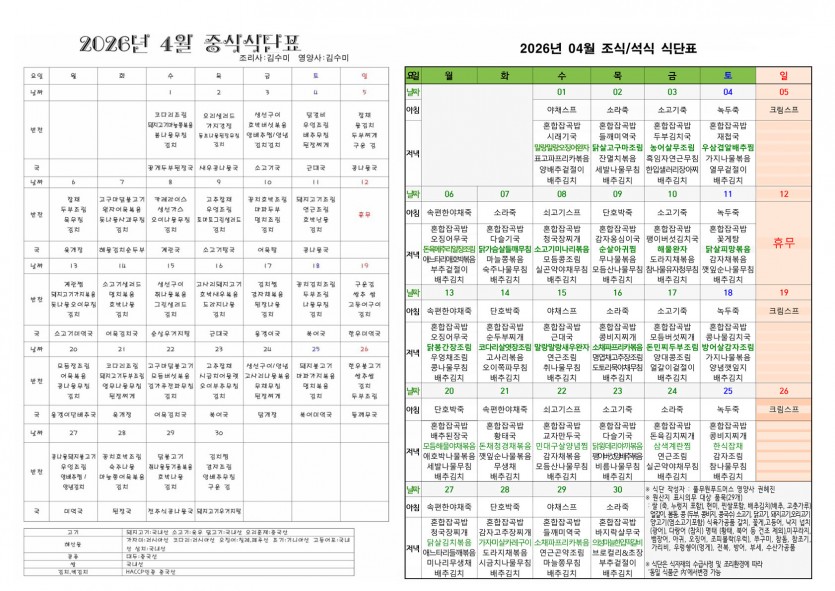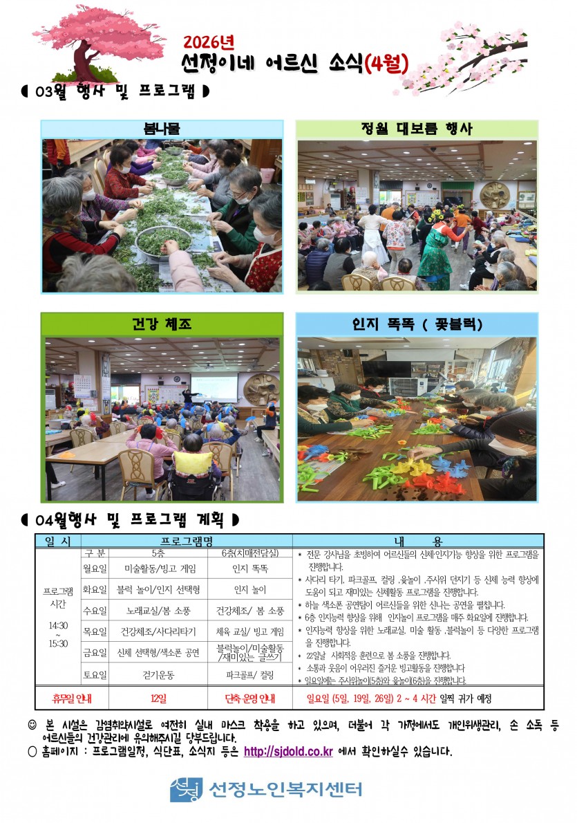 2026년 4월 식단표 및 소식지 페이지 정보 작성자 최고관리자 댓글 0건 조회 91회 작성일 26-03-31 14:57 본문 2026년 4월 식단표 및 소식지 입니다. 목록 이전글*연명의료결정제도 교육 실시 합니다. * 26.04.10 다음글2026년 4월 치매전담실 프로그램 운영표 26.03.31